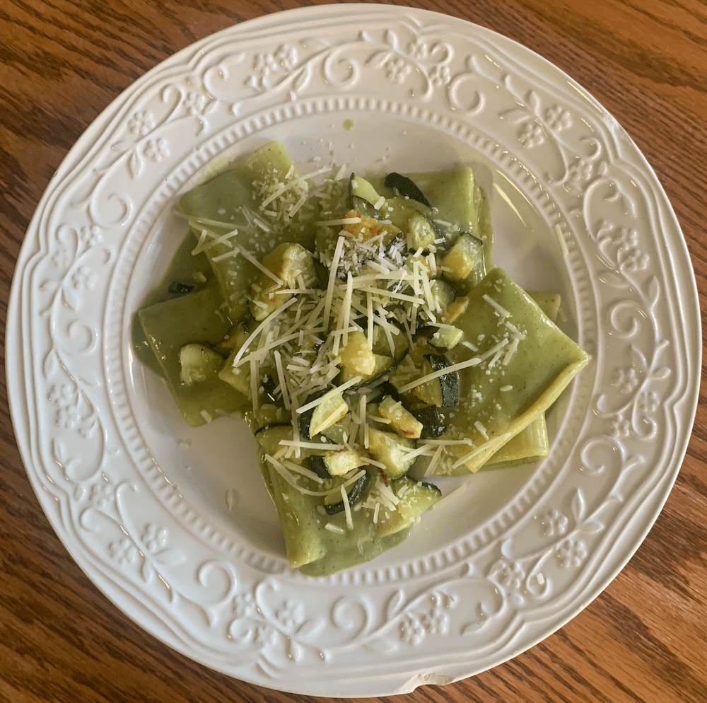 - Put the cooked zucchini mix in the blender and add 1/2 cup of the the saved pasta water. Once blended, pour back in the pan and add the cooked pasta. Toss to coat. Add saved pasta water as needed to thicken the sauce.