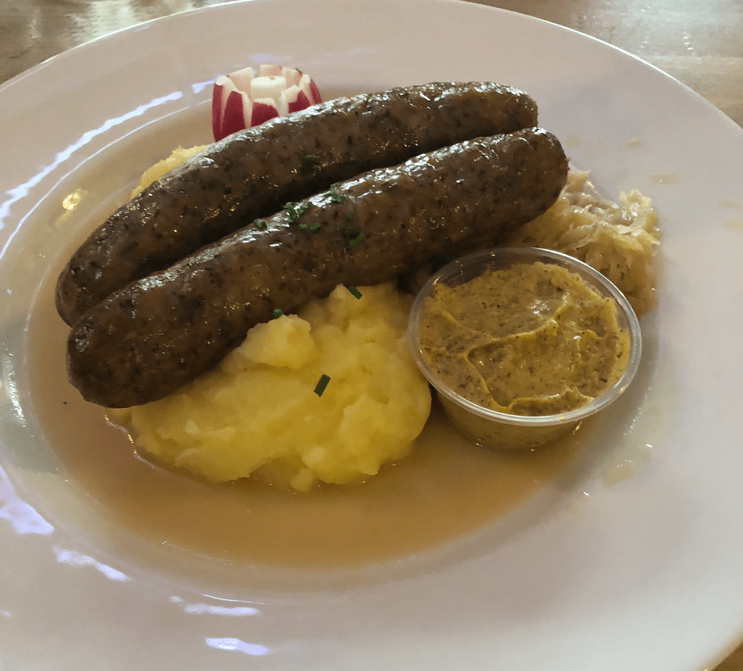 What I ate: Roasted chicken sausages with sides of sauerkraut and mashed potatoes. I shared a pretzel with cheese sauce and vegan schnitzel with my mom. We got black forest gateau to-go for dessert.