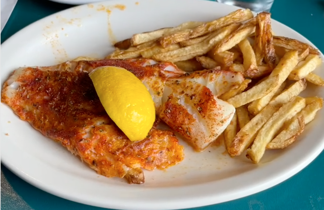 What I ate: Pita garlic chips with spinach artichoke dip, cajun cod, pasta salad, and french fries