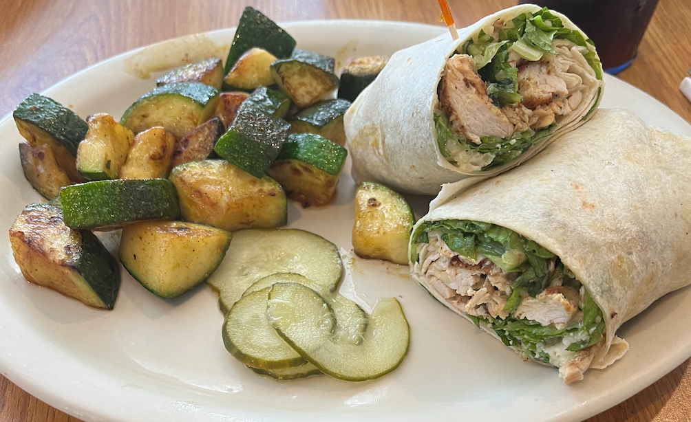 What I liked about this meal: The chicken is fully cooked and well seasoned. The caesar dressing is perfectly light on the wrap and the chicken. The Zucchini fries are crunchy and well seasoned at the same time.