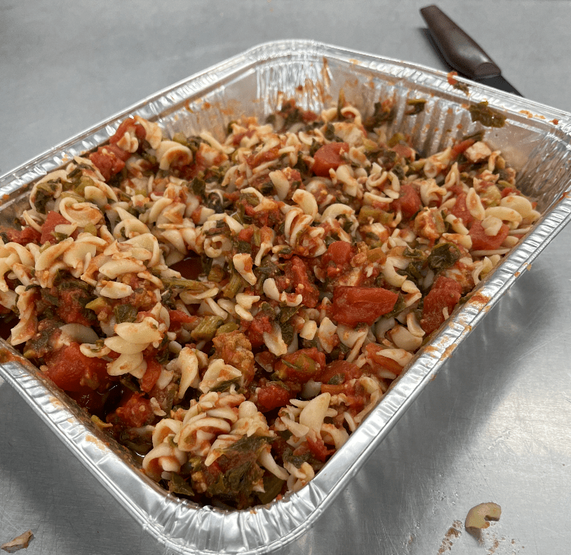 - I baked it all together in the tray at 350 degrees for about 40 minutes or until hot all the way through.