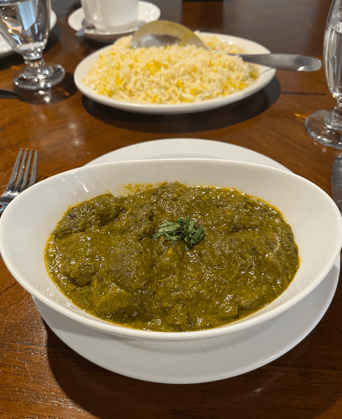 What I ate: chicken saag (spinach sauce), basmati rice, and naan