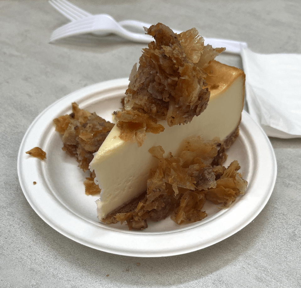 “The baklava cheesecake is rich. I love the sweetness and the crunch of the honey nuts, including the phyllo dough on top.”