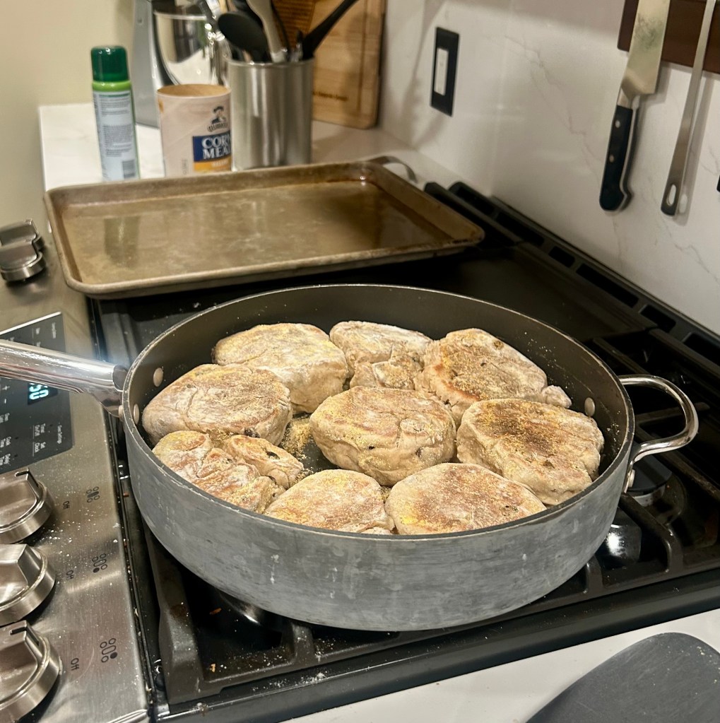 - Lightly grease a pan and place over medium heat. Dip each side of the dough balls into corn meal and then pan fry for 1-2 minutes on each side until a golden crust forms.