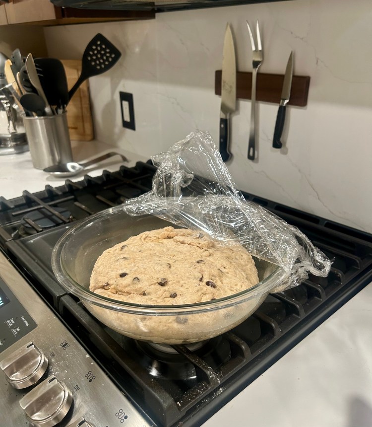 - Next add all the other ingredients – milk, butter, flour, salt, 2 tbsp brown sugar, cinnamon, and raisins. Stir until a shaggy dough forms.